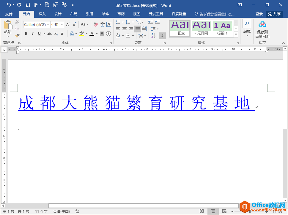 4.返回文档,可以看到文本“成都大熊猫繁育研究基地”已经变为蓝色,并且下方有一条横线,表示超链接已经添加成功。接下来我们按住ctrl键单击文本,就能快速跳转到“成都大熊猫繁育研究基地”的网站了。