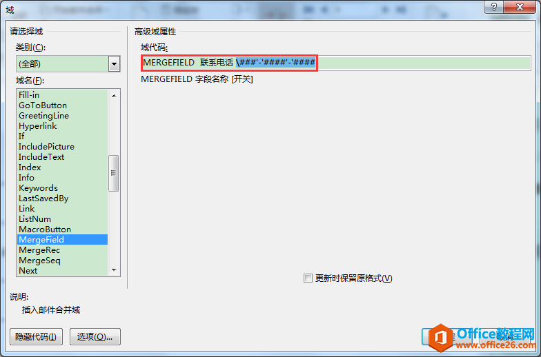 如果我们要将《考生信息表》中插入的"联系电话"合并域的格式显示为"103-7501-0351"样式,也是按照同样的办法打开"域"对话框再修改域代码。这里要将光标定位在域代码编辑框中默认显示的"MERGEFIELD 联系电话 "之后,在英文输入法状态下输入"\###'-'####'-'####",最后单击"确定"按钮即可。