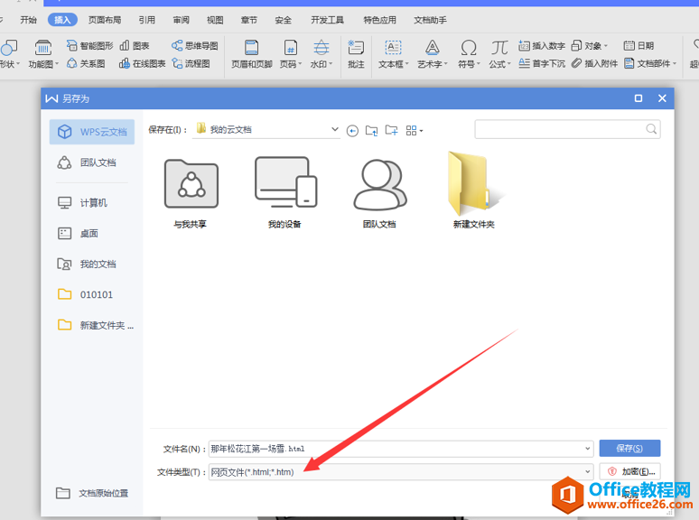 第三步:在弹出“另存为”对话框里下方的保存文件类型中选择“网页文件*.html”,然后找到保存的位置并点击保存: