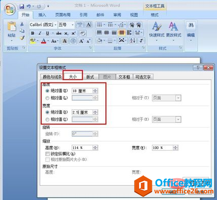5、进入“设置文本框格式”界面,在“大小”中设置高度和宽度,在“文本框”中设置垂直对齐方式为“居中”,然后点击“确定”。