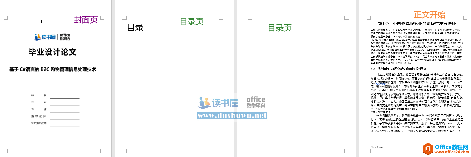通过“ctrl+enter”强制性分页把先空出前三页,然后把第一页封面页按要求排版出来,第一页就是论文标题标志指导老师这些信息,并在第二页先输入目录两个文字。