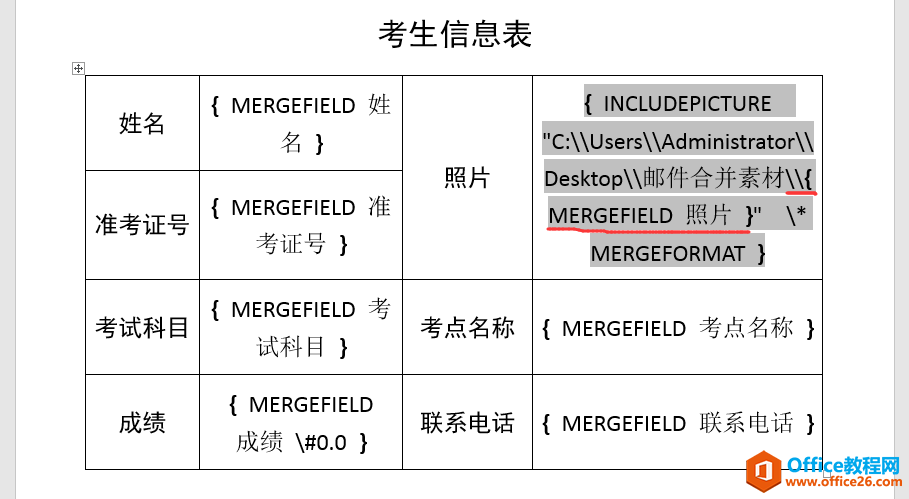 1、打开《考生信息表》样板所在的Word文档,通过邮件合并功能选择收件人,并在相应的空白单元格中插入除"照片"之外的合并域。(相关操作流程可阅读文章:word利用邮件合并功能快速批量生成个人信息表 ,本文重点在讲如何批量插入图片。)