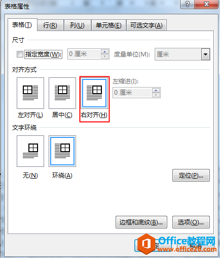 注:默认为无环绕,此时表格单独占据行,左右没有文字。