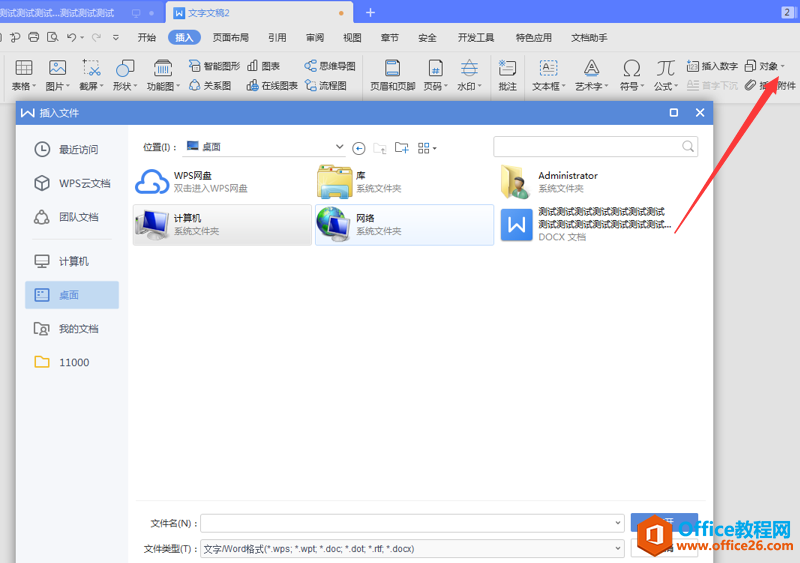 第三步:在“插入”菜单栏下工具栏里面点击“对象”按钮旁边的黑色倒三角: