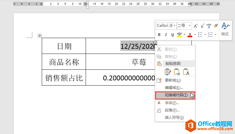 1.选中"销售额占比"合并域,单击鼠标右键,在弹出的菜单中选择"切换域代码",进入域代码编辑模式。