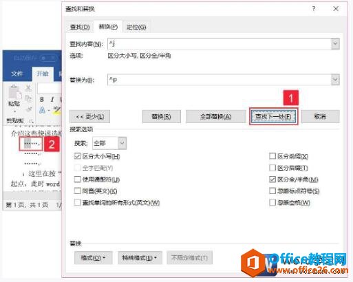 步骤2、弹出“查找和替换”对话框,在“查找内容”文本框中输入要查找的内容,例如“Word”,在“替换为”文本框中输入要替换的内容,例如“word”,单击“搜索”下拉按钮选择搜索方向。由于替换的内容只是大小写不同,所以需要勾选“区分大小写”前的复选框,然后单击“查找下一处”按钮,即可看到Word文档中查找到的内容,如图2所示。