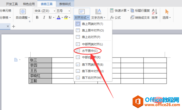 3、点击后找到:水平居中,直接点击它,具体如下图所示