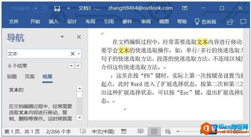 步骤2、此时,Word 2019会在窗口左侧打开“导航”对话框。在搜索框内输入需要查找的文本内容,按“Enter”键即可进行查找。Word 2019将在“导航”对话框内列出查找结果,同时右侧的文本编辑区也会将查找到的文字内容突出显示。此时,在“导航”对话框内单击该段落选项,文档将定位到该段落,如图2所示。