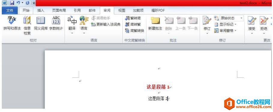 1、Word2010打开test2.doc文档,选中需要插入其他文档的位置,然后在选项卡中点击“插入”,选择对象“文件中的文字”。