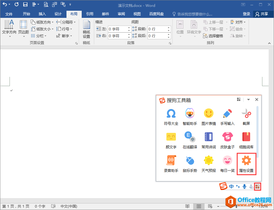 1.单击搜狗拼音输入法状态栏右侧的“工具箱”按钮,在弹出的“搜狗工具箱”中单击“属性设置”按钮。