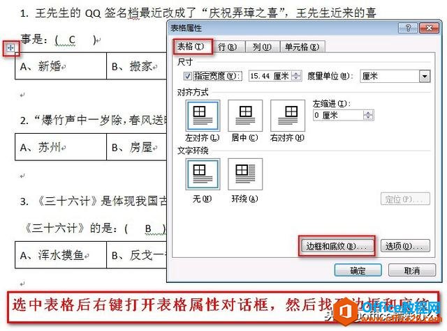 3、选中表格右键打开“表格属性”对话框,找到“边框和底纹”按钮。