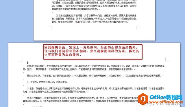 4、回到word编辑页面,发现上一页是纵向,后面的全部页面是恒星,这与我们当初的目的不相符,那么用同样的方法将其它横向页面设置为纵向即可。