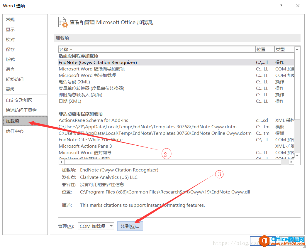 以管理员身份打开word。在文件>选项>加载项>com加载项>转到,如下图: