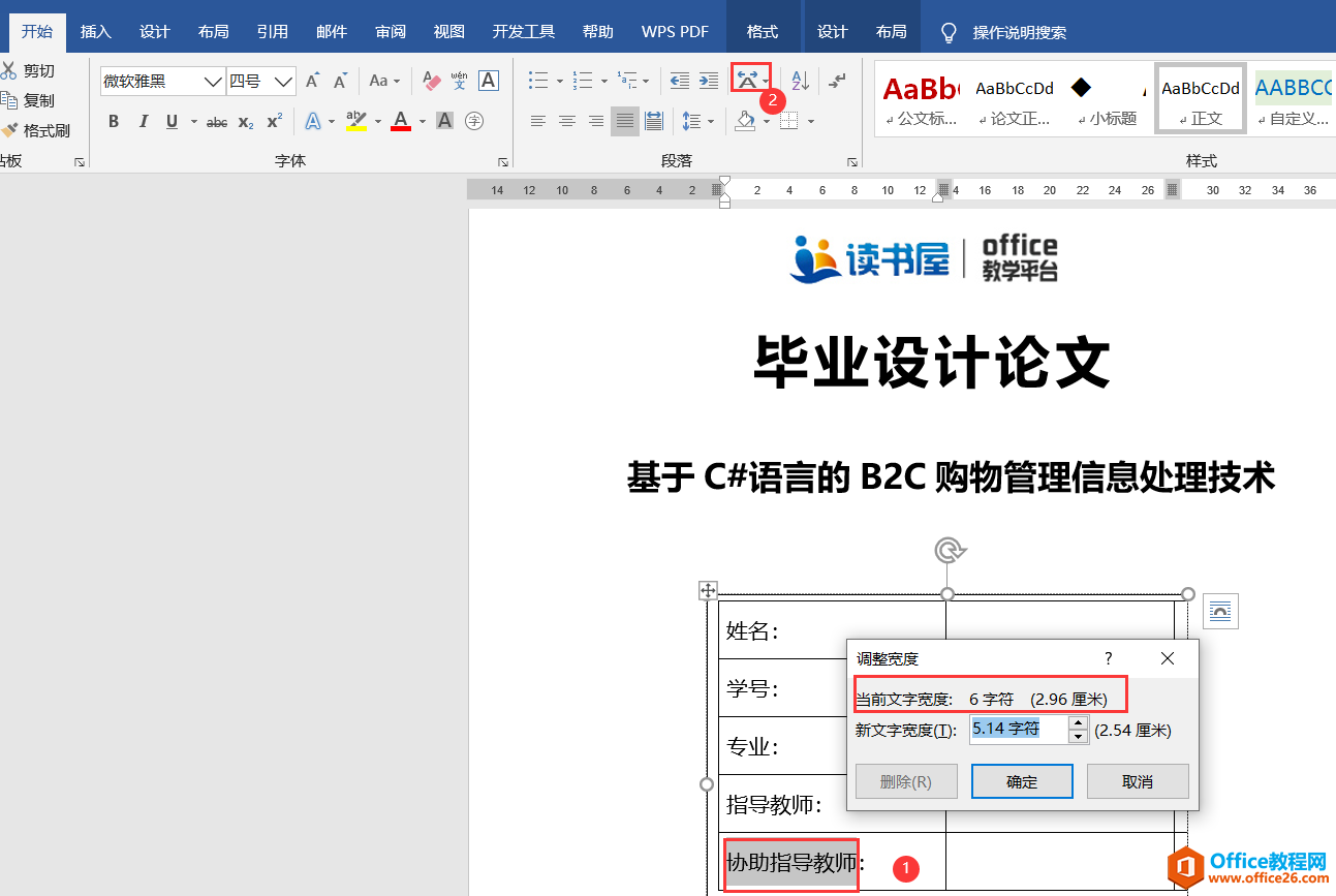 第六步:依次选定上方“姓名、学号、专业等”内容,再次执行“调整宽度”命令,设置其新文字宽度为“6”,而这个6就是文字较多的“协助指导教师”这一行内容所占宽度。