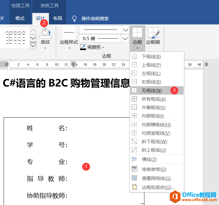 第八步:全选表格,通过【表格工具】—【设计】—【边框】—“无框线”,先让其变成无框线