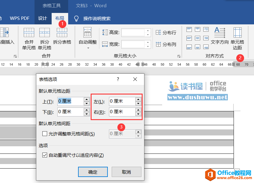 第二步:设置【表格工具】—【布局】—【单元格边距】的左右边距为0,这样为了以后插入图片直接贴着单元格边框了。