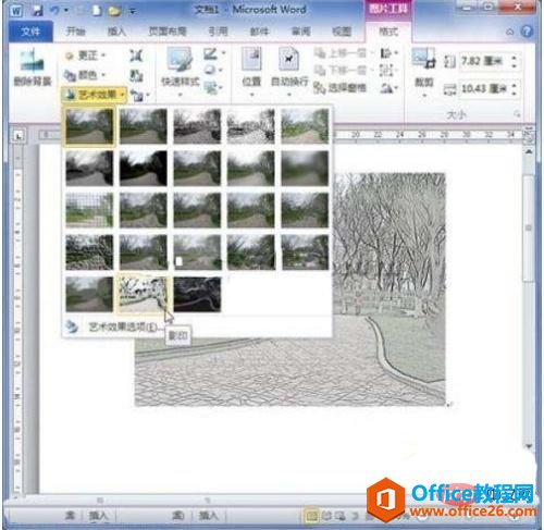 1、打开Word2010文档窗口,选中准备设置艺术效果的图片。在“图片工具”功能区的“格式”选项卡中,单击“调整”分组中的“艺术效果”按钮。