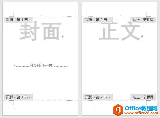 此时,文档分成两个部分,封面为第一节,正文为第二节。注意,Word2016及以下版本时,分节符位于【页面布局】选项卡。