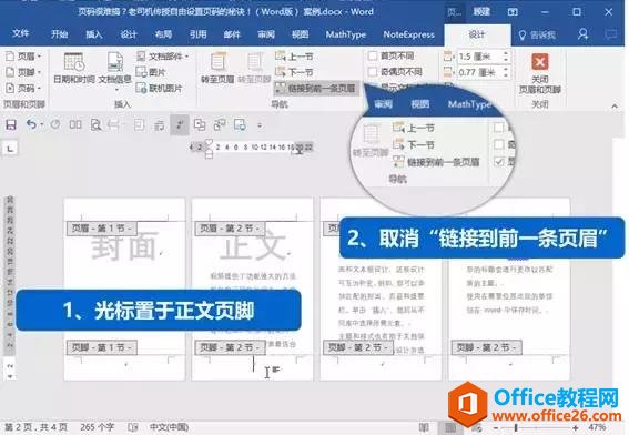 第二步:取消【链接到前一条页眉】设置,以便对每节进行单独编写