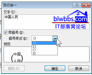 2、在弹出的“双行合一”对话框,若要对合并的文字添加括号,则勾选“带括号”复选框,然后在“括号样式”下拉列表中选择括号样式,如图所示。
