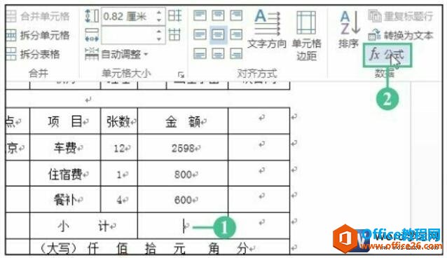 打开一个有数据的word文档,1、选中需要显示计算结果的单元格,2、在“表格工具-布局”选项卡的“数据”组中单击“公式”按钮,如下图1所示。
