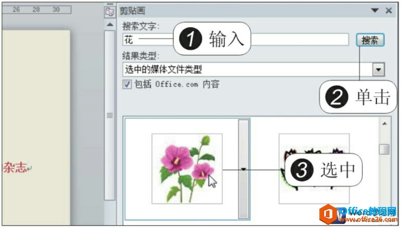 在文档主界面右侧出现了“剪贴画”窗格,在“搜索文字”文本框中输入“花”,单击“搜索”按钮,在搜索结果的列表框中选中要插入的剪贴画,如下图5所示。