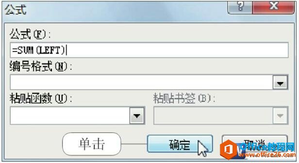 弹出“公式”对话框,在“公式”文本框中自动显示出求左侧单元格区域数据之和的计算公式,单击“确定”按钮,如下图2所示。