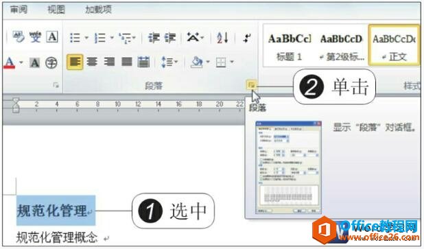 选中文档的标题,单击“段落”组中的对话框启动器,如下图3所示。