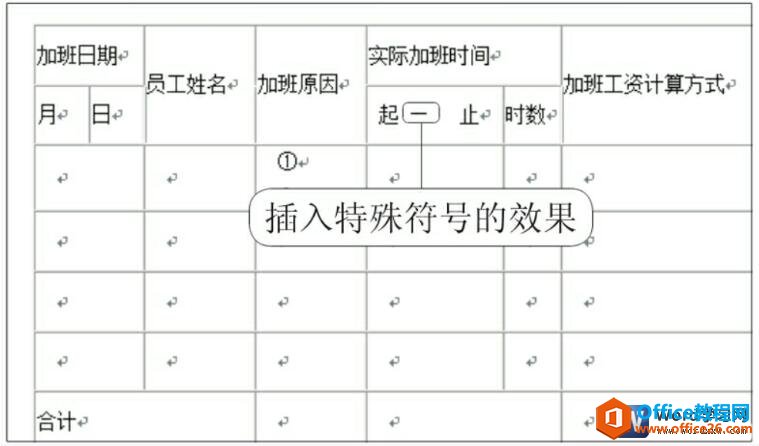 此时可以看见,在光标定位的位置处插入了一个符号,员工可以将加班原因分为几条来说明。将光标定位在“起”字之后,如下图2所示。