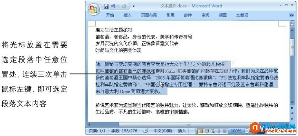 用户可以选定文档中的整段文本内容,其具体的操作方法如下。