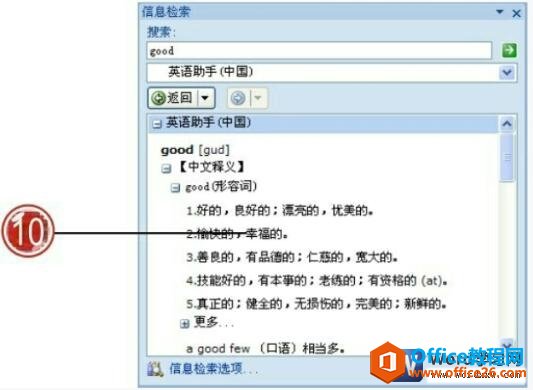 10、在“信息检索”窗格中显示搜索单词的所有英文注解内容,可以帮助我们更快更方便地了解疑难单词。