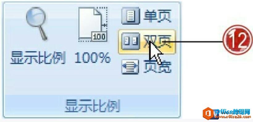12、文档恢复到100%显示比例状态下,如果我们需要在窗口中同时显示双页文档内容,则单击“显示比例”组中的“双页”按钮。