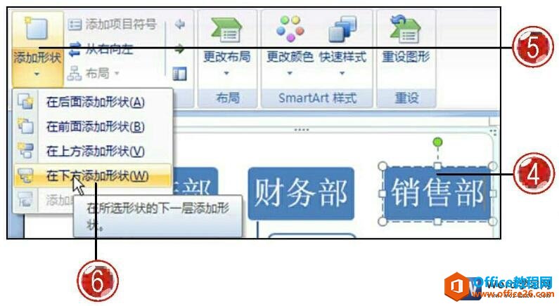 3、切换到SmartArt图形“设计”选项卡下,在“创建图形”组中单击“添加形状”按钮,在展开的列表中单击“在后面添加形状”选项。