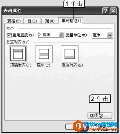 1、将光标定位到第1行第1列单元格中,选择【表格】→【表格属性】菜单命令,打开“表格属性”对话框,单击“单元格”选项卡,单击选项按钮,如图1所示。