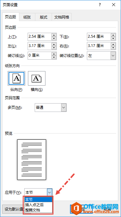 而在同一文档中为页面设置两个不同的页边距或纸张方向,可以【页面设置】对话框中,在【应用于】选项中选择应用于本节或应用于插入点之后来实现。