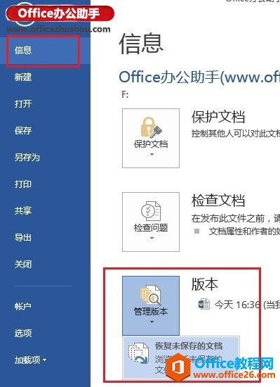 2、现在正式开始如何恢复未保存Word文档的操作。再次启动Word 2013程序,依次点击“文件”--“信息”--“管理版本”--“恢复未保存的文档”,如下图所示。