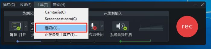 单击“录像控制面板”菜单中“工具”,单击下拉框内“选项”,启动“工具选项设置面板”。