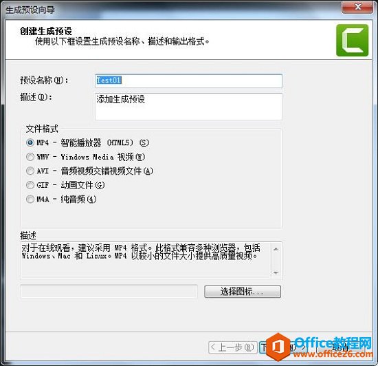 第三步:在管理生成预设界面中点击新建,输入预设名称Test01,在描述中填入添加生成预设,然后选择输出视频格式为MP4格式。点击下一步。