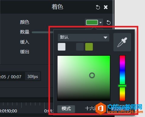点击“颜色”选项中的三角形,我们可以通过鼠标选择来得到不同的颜色,也可以选择“滴管”工具来在屏幕上取色,“数量”选项则用来调整颜色的透明度。调整颜色后,可以看到视频出现的变化:所选择的颜色以滤镜的形式覆盖在了源视频之上。关于颜色的调整,请参考:Camtasia Studio的移除颜色和设备帧