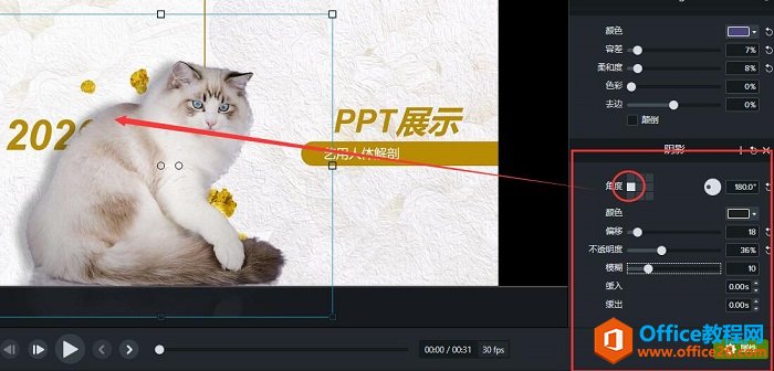 选中猫咪视频,右侧出现属性栏。调整“角度”到左侧或者右侧,“颜色”“偏移”“不透明度”等数值一般默认值就很合适了,不需要过多调整。增加了阴影后,即使是抠像之后添加的背景也会感觉比较自然。