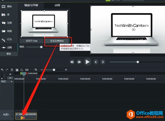 首先,在把Spinning Computer拖放到轨道上后,我们要点开Camtasia中的“动画”选项卡。(如果没有如下图般直接在左列中显示,可以点开“更多”找到“动画”选项卡。)