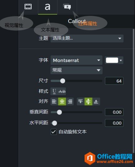 从图中我们可以看出,在隐藏面板中有三个属性:视觉属性,文本属性和注释属性。在这里我们着重讲一下注释属性,具体内容可以查看:认识Camtasia里注释的属性。点击打开“注释属性”面板。如图五。