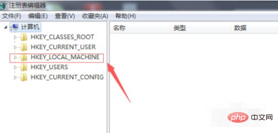 3、打开“HKEY_LOCAL_MACHINE”文件夹;