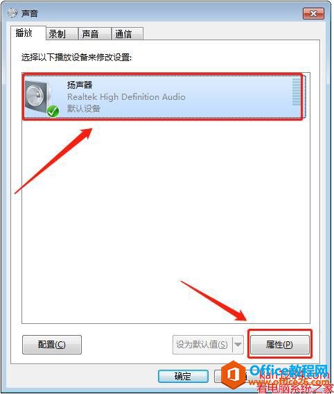 第二步:在弹出的“声音”窗口中选中“扬声器”---》然后点击“属性”;