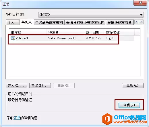 查以在“其他人”中,查看到刚才安装的x3650m3证书。然后,点击“查看”