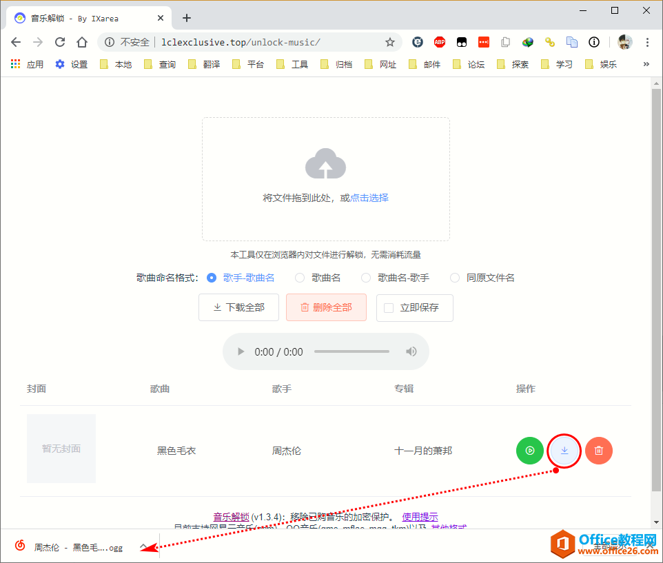 打开上方给出的网址,将刚刚下载到的加密音乐文件拖动至指定位置,若无意外,会提示解锁成功,然后页面下方列表区会提供解密完成的音乐文件选项,将该文件下载到本地。