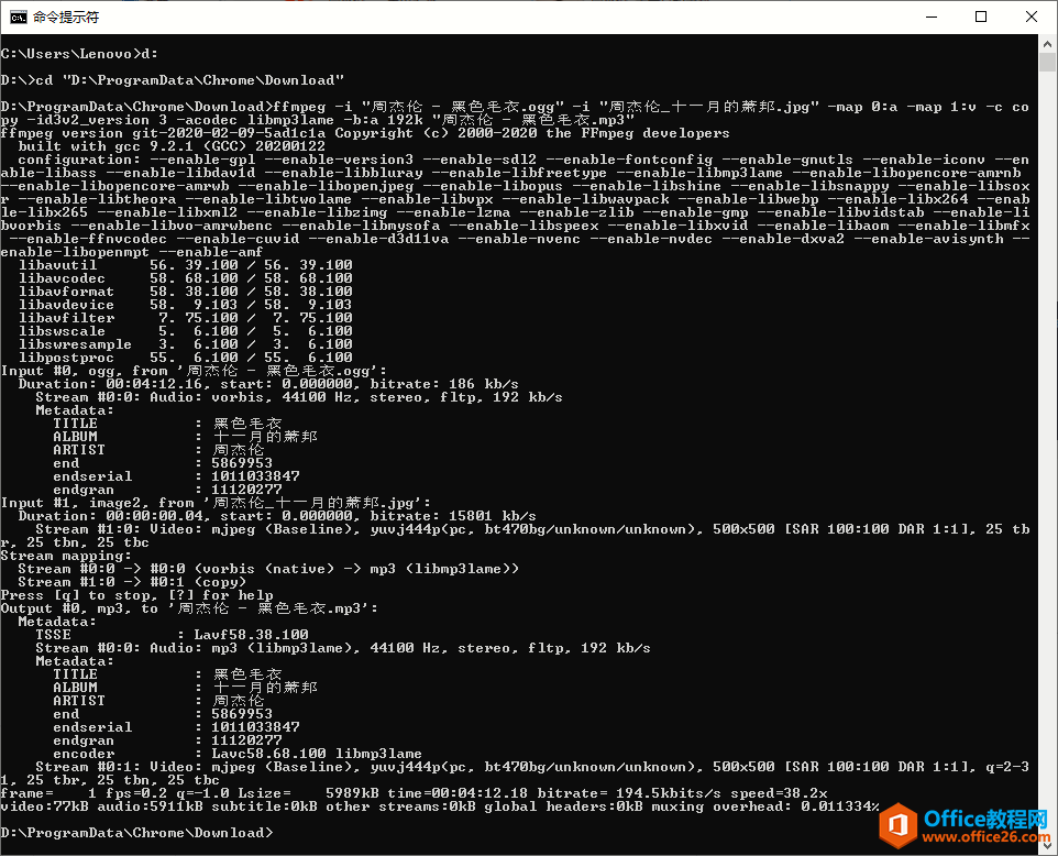 打开命令提示符窗口,定位到上述文件夹下,按如下命令格式调用FFMpeg执行转换命令,耐心等待命令执行完毕,之后就可以在目标目录中看到转换完成的音乐文件了,下图供参考。