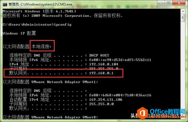 2、出现下面这个DOS窗口,输入ipconfig,然后回车,看下你的路由网关是多少,我这边的路由网关是192.168.0.1,不同网络网关可能不同。