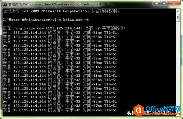 4、再来检测一下外网的情况。我们可以输入ping baidu.com -t,为什么要ping 百度呢?因为百度是外部网络地址,通过观察电脑与之相连的状况就可以判断外网是否正常。像下面这样的情况就是正常的。