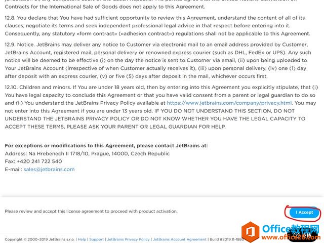 5.进入协议页面,下翻网页,点击“I Accept”蓝色按钮。之后会进入JetBrains账号登录页面。